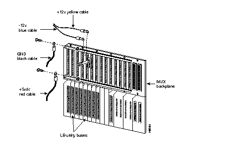 Step 7 Remove and save all 12 mounting screws and lock washers from the backplane. Do not unscrew the +5 VDC and GND bus bars from MUXBUS backplane.