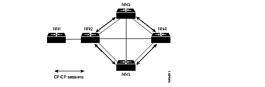 For example, in Figure 6-9, NN2, NN3, NN4, and NN5 are in a fully meshed network. Every network node establishes CP-CP sessions with its adjacent network nodes. This means that NN2 establishes CP-CP sessions with NN3, NN4, and NN5. NN3 establishes CP-CP sessions with NN2, NN4, NN5, and so forth.
