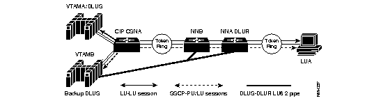 All the subarea SSCP/PU and SSCP/LU sessions flow on one of the transmission groups between the DLUR router and the primary DLUS host. As for the LU-LU sessions, the two possible routes between the DLUR router and a VTAM host are available. The DLUR router and a VTAM host select one of these two routes at random for the LU-LU sessions. This randomization provides a certain amount of load distribution across the two CIP routers, although it might not necessarily be statistically load balanced.