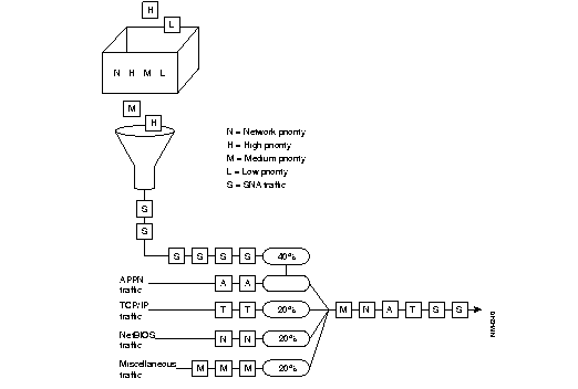 The intent is to reserve bandwidth for a particular type of traffic. For example, in Figure 2-6, SNA has 40 percent of the bandwidth reserved using custom queuing, TCP/IP 20 percent, NetBIOS 20 percent and the remaining protocols 20 percent. The APPN protocol itself has the concept of class of service (COS), which determines the transmission priority for every message. APPN prioritizes the traffic before sending it to the DLC transmission queue.