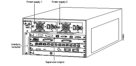 Figure 8-3 shows a rear view of the Catalyst 5002 2-slot chassis with one installed supervisor engine and one switching module.