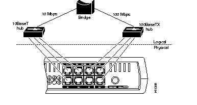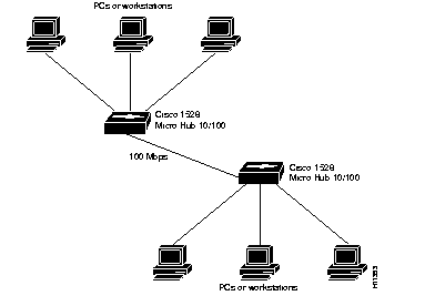 The hub can provide a connection to another Cisco 1528 Micro Hub 10/100 as shown in Figure A-3. In this example, the two hubs will autonegotiate the speed of the connection to 100 Mbps.