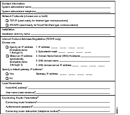 The worksheet in Table 1-1 lists the information needed to install the Cisco 200 software. Have your system administrator fill out the worksheet with the appropriate information for your installation. Place the completed worksheet in your Site Log.