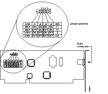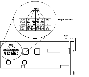 Jumper switches 1 through 4 are located at J1 through J4 and are clearly marked on the ISDN Adapter, as shown in Figure 1-1 (Cisco 201) and Figure 1-2 (Cisco 202). Set these jumpers as necessary to have IRQ and I/O port address settings for the ISDN Adapter that are unique within your PC.