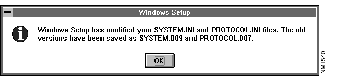 Windows will modify your WIN.INI, SYSTEM.INI, PROTOCOL.INI, AUTOEXEC.BAT, and NET.CFG files. Two dialog boxes appear. See Figure 3-11 and Figure 3-12.