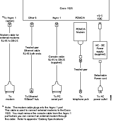 The following instructions are for connecting the Cisco 1020 to a network, a telephone jack, and a console (PC serial port, ASCII terminal, or external modem). See Figure 3-5.
