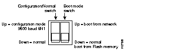The right switch controls boot mode. When UP, the Cisco 1020 boots from the network using Reverse Address Resolution Protocol (RARP) and Trivial File Transfer Protocol (TFTP). When DOWN, the Cisco 1020 boots from internal flash memory.