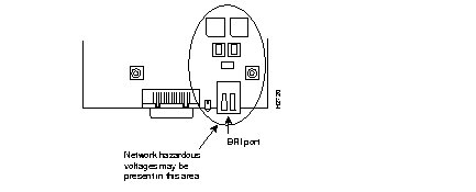 ![]() | Warning Hazardous network voltages are present in the BRI cable. If you detach the BRI cable, detach the end away from the AccessPro card first to avoid possible electric shock. Network hazardous voltages also are present on the system card in the area of the BRI port (RJ-45 connector), regardless of when power is turned off. (See Figure 3-12.) (To see translated versions of this warning, refer to the appendix "Translated Safety Warnings.") |