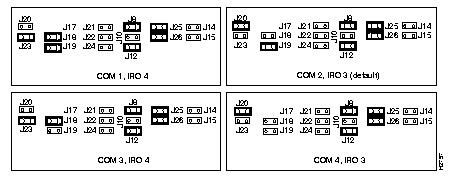 Figure 3-3 illustrates how to set the different combinations of COMports and IRQs for the Ethernet AccessPro card. Figure 3-4 illustrates how to set the different combinations of COMports and IRQs for the Token Ring AccessPro card.