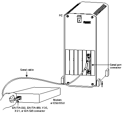 Step 3 Use a special serial cable to connect the serial port to the modem or CSU/DSU, as shown in Figure 3-11. This cable is available from us and is usually ordered with the system. The cable uses a DB-60 connector on the chassis end. For cable specifications, see the appendix "Cabling Specifications." For ordering information, contact a customer service representative.