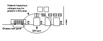 ![]() | Warning This warning applies to all models that include a BRI port. Network hazardous voltages are accessible in the basic rate interface (BRI) cable. If you detach the BRI cable, detach the end away from the router first to avoid possible electric shock. Network hazardous voltages are also accessible on the system card in the area of the BRI port (RJ-45 connector), even when the power is OFF. (See Figure 1.) |