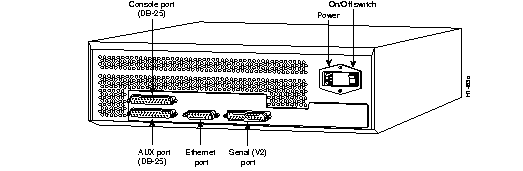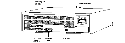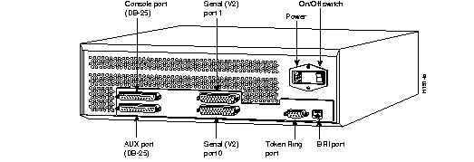 When viewed from the rear, the power cable and power switch appear on the right side of the chassis. The ports for the system console, auxiliary (AUX), LAN (Token Ring, Ethernet, or BRI), and serial line appear to the left of the power cable and switch. The configuration depends on which model you purchase. Refer to Figures 2-2 through 2-7 for rear views of the different router configurations.