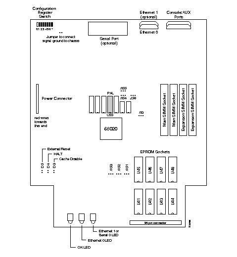 Figure 1-2 illustrates the IGS card layout. The card is oriented with the front panel LEDs at the bottom of the illustration. Refer to this figure to locate the EPROMs on the system card.