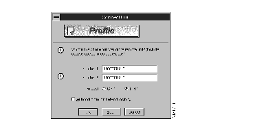 Enter the appropriate information into the Profile Configuration dialog box. For information about each field, see Step 8 in "Creating Configurations," which appears earlier in this chapter. Table 3-1, in the same section, summarizes the conditions set by the Automatic Dial check box.