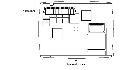 Step 1 If the router has a DRAM SIMM already installed, locate it on the system card. With the rear panel of the router facing you, the DRAM SIMM is located in the upper left corner of the system card, as shown in Figure 4. If there is no DRAM SIMM installed the router, proceed to Step 3 to install a DRAM SIMM in the location shown in Figure 4.