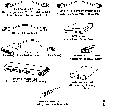 Figure 1-8 shows items that you will have to provide to install your router. You will require only some of these items, depending on what Cisco 1600 model you are installing.