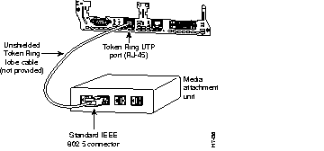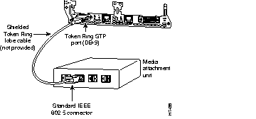 Use a shielded Token Ring lobe cable to connect the Token Ring STP port (DB-9) to a MAU. Use an unshielded Token Ring lobe cable to connect the Token Ring UTP port (RJ-45) to a MAU. (See Figure 3-22 and Figure 3-23.) Only one of the Token Ring connectors can be used. The module will automatically detect which connector is in use.