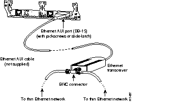 Use an Ethernet AUI cable to connect the Ethernet AUI port (DB-15) to an Ethernet transceiver. Use an Ethernet 10BaseT cable to connect to an Ethernet 10BaseT port (RJ-45). (See Figure 3-20 and Figure 3-21.) Only one connector can be used per Ethernet interface. The Ethernet modules will automatically detect which connector is used.