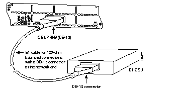 Step 7 If you have a 120-ohm CE1/PRI-B module installed in your router, use the appropriate cable to connect the CE1/PRI-B port to an E1 CSU. (See Figure 3-33, Figure 3-34, and Figure 3-35.)