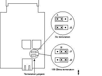 For the older card, the jumpers are factory-configured in the B position (100 ohms termination). Keep the jumpers in this position to use the BRI S/T WAN interface card in a point-to-point connection or as the last device on the line of a passive-bus connection. Set the termination jumpers to the A position to use the BRI S/T WAN interface card in a passive-bus connection where it is not the last device on the line.