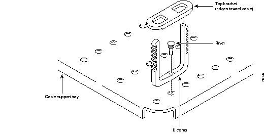 Step 1 Align the hole in the center of the U-shaped cable clamp with a hole in the cable support tray and insert the rivet through both holes. (See Figure 24.)
