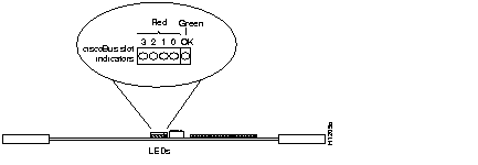 The LEDs on the CCTL2 card indicate when an interface is present in a ciscoBus slot. The front edge of the CCTL2 card contains a bank of five LEDs as shown in Figure 2: one red LED for each slot in the ciscoBus and one green OK LED to indicate a successful boot procedure. One red LED will be on for each correctly connected ciscoBus card using the correct version of microcode. The green OK LED will not be on if the card is incorrectly connected or if the microcode on that ciscoBus card is the wrong version. Figure 2 shows the LEDs on the CCTL2 card. The numbers above the LEDs (0 through 3 from right to left) indicate the ciscoBus slot number assigned to that LED.
