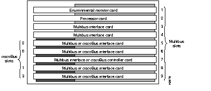The system card cage, shown in Figure 3, has nine slots, five of which are designated ciscoBus slots. The center ciscoBus slot is reserved for the ciscoBus controller card, leaving four ciscoBus slots available for ciscoBus interface cards.