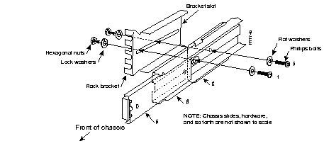 ![]() | Caution This procedure requires two people: one to hold the chassis and the other to attach the screws through the rack brackets on the slide assemblies. The chassis assembly is heavy with the slide assemblies attached, and it may be awkward and dangerous for only one person to attempt. |