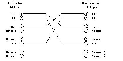 If you are not connected to a hub, and another 10BaseT transceiver applique is connected to the opposite end of your link, the UTP cabling must be crossed as shown in Figure A-4. The RD- and RD+ signals must be swapped with the TD- and TD+ signals. When the opposite end of your link is connected to a hub, the hub performs this crossover function, and it is not necessary to cross the cables.