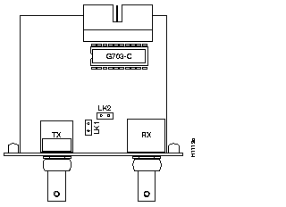 The G.703 network interface is the output port, consisting of two BNC connectors (TX and RX), adjacent to the approval symbol. The input port is connected by a ribbon cable to either a CSC-MCI or CSC-SCI interface card. Clocking (timing) for the G.703 applique is derived from the network input at approximately 2048 kilobits per second (Kbps) (E1 speed). The G.703 supports only DTE. You must use two 75-ohm coaxial cables, of diameter 5 mm, terminated in male BNC connectors with maximum cable attenuation of 6 decibels (dB) at 1024 kilohertz (KHz). Attenuation characteristics should follow the root f law. The outer conductor is isolated from system earth. A single applique can be mounted on an individual plate. Figure A-5 shows the layout of the G.703 applique.