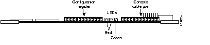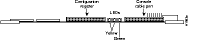 To the right of the configuration register, on the front edge of the processor card, are three LEDs. On the CSC/3, the left and center LEDs are red (see Figure B-2), while on the CSC/4, they are yellow (see Figure B-3). The third LED (far right) on each card is green. The LED on the left is a software-programmable status light; it lights (momentarily) during initialization, flashes to indicate an error, and remains off under normal operation. The middle LED is the processor halt light; it lights when the processor halts for any reason. This LED can flash at power-up, but should not remain lit; a problem is indicated when it does. The green LED on the right is a software-programmable run light that lights when the system is running properly.