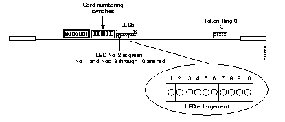 Along the front edge of the CSC-1R (and CSC-2R) card are ten status LEDs: nine red and one green. The order of the LEDs is left to right when looking at the front edge of the card. (See Figure B-1.) Although only the CSC-1R is shown, both the CSC-1R and CSC-2R have the same LED configuration. The CPT cannot use Token Ring interfaces. The CGS can use only the CSC-2R.