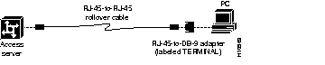 Use the RJ-45-to-RJ-45 rollover cable and RJ-45-to-DB-9 female DTE adapter (labeled TERMINAL) to connect the console port to a PC running terminal emulation software. Figure C-2 shows how to connect the console port to a PC. Table C-1 lists the pinouts for the asynchronous serial console port, the RJ-45-to-RJ-45 rollover cable, and the RJ-45-to-DB-9 female DTE adapter (labeled TERMINAL).