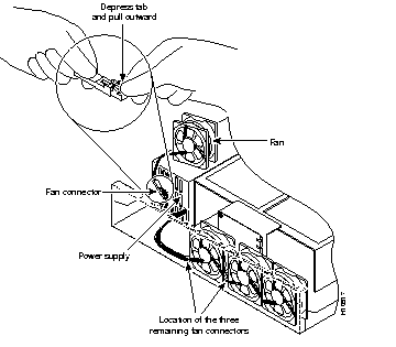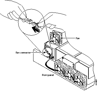 ![]() | Caution Do not attempt to remove the fan cables without first depressing the tab as shown in Figure A-23. You can damage the fan cables by applying stress if the connector is not removed properly. |