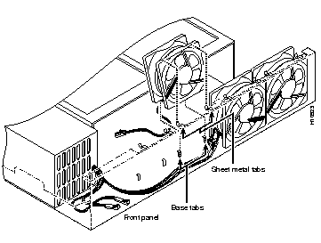 Step 4 Insert the middle fan as shown in Figure A-28, making sure that the cable feeds to your left. Position the cables to the two installed fans so that they will fit under the first and second fans. Press the fan into place between the four sheet metal tabs.
