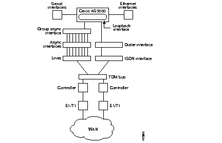 To configure remote services, you must configure three interrelated interfaces on the access server. The loopback interface makes the network appear as if the dial-in users exist on one Ethernet segment. The loopback interface has the following four types of neighboring interfaces used for dial-in operations: ISDN interface, dialer interface, group asynchronous interface, and asynchronous interface. Figure 1-1 shows an internal view of the components used to process incoming ISDN and analog calls on an access server.