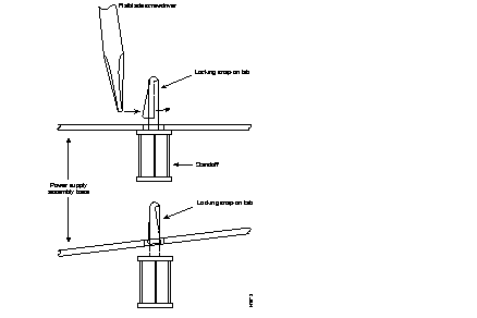 Step 6: Use needle-nosed pliers or a small screwdriver to push the tab inward while you slip the power supply assembly base over the tab (see Figure 4-9). Only lift the base up far enough to prevent the tab from snapping back into place; if you try to pull it completely off the standoff, you might damage the card or other standoffs.