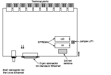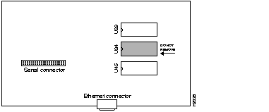 STS-10x and the STS-10 system cards have two system software EPROMs. The EPROM locations vary according to the generation of system card. Use Figure 1 through Figure 4 to determine which generation of STS-10 Terminal Server you have.