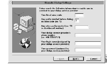If you're installing the remote access software, the Install program next opens the Remote Dialup Settings window. (See Figure 2-5.) You'll use the information that you recorded in Table 1-2, "Local Modem or ISDN Adapter Information" to complete the installation procedure.
