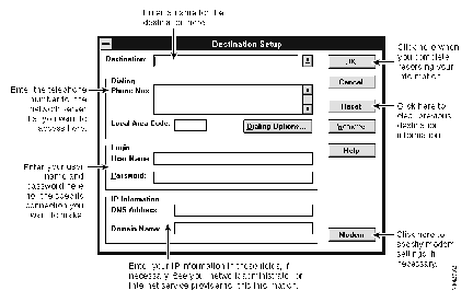 To set up a destination, you record information about the remote network server to which you want to connect.You include the telephone number of the network, your login information, and Internet Protocol (IP) information, if required.