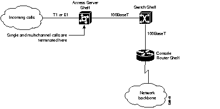For example, an Access Server Shelf has four lines. In a T1 Primary Rate Interface (PRI) configuration, each of these lines can handle 23 calls (23B+D). The maximum configuration of four Access Server Shelves provides a maximum capacity of 368 ISDN 1B+D BRI calls. The calls are terminated, aggregated, and multiplexed in the Access Server Shelf, then sent over a 100BaseT Fast Ethernet connection to the Console Router Shelf.