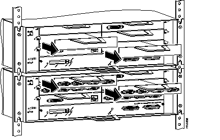 Step 3 Swap the Serial Port Adapters into slots 2 and 3 on the new Router Shelf and the blank Port Adapter guards into slots 4 and 5 on the existing Router Shelf. See Figure A-14.