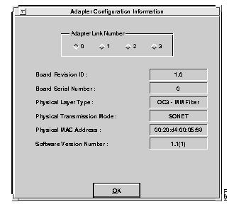 To display basic configuration information about the adapter or to set the transmission mode, select the Adapter Configuration option from the Cisco ATM SBus Adapter utility main menu.