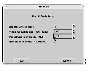Select the Run All Tests option to initiate all tests displayed on the Diagnostics/Data Activity menu. The Test Setup window appears, as shown in Figure 6-2. Set up the test parameters, using the information provided in the "Test Setup Window" section. To run all tests, you must first confirm that a loopback cable has been connected and later check that another system is transmitting information over the same virtual circuit at the appropriate time. Refer to Figure 6-5 and Figure 6-8 for examples of the confirmation windows that appear.