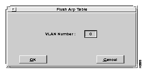 To delete all entries in the server ARP table, select the Flush Table option from the Server ARP Table window. The Flush Arp Table window appears, as shown in Figure 6-24. Enter the number of the VLAN from which you want all server ARP table entries removed, and select the OK option. All entries are removed from the server ARP table for the specified VLAN number.
