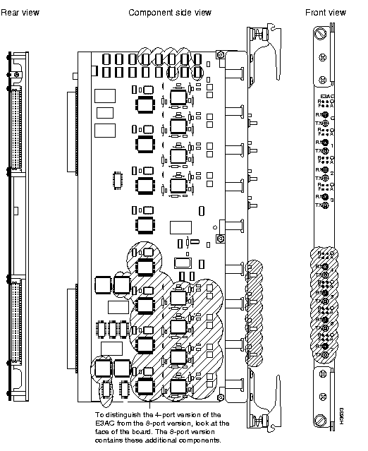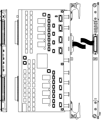 Figure 1-32 shows front, rear, and component side views of the T1 CEMAC. Figure 1-33 shows front, rear, and component side views of the E1 CEMAC.