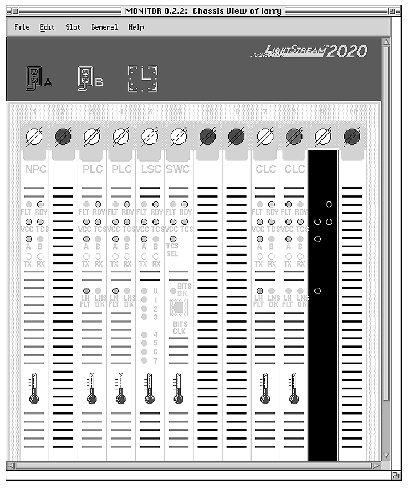 The LS2020 monitor provides a graphical display of individual LS2020 switches, cards, and ports. The LS2020 monitor runs only on a Sun SPARCstation. When you start the monitor application, the display shows the front of an LS2020 switch with bulkheads for the cards as they appear in the actual switch. Information pertinent to the switch displays above the bulkheads.