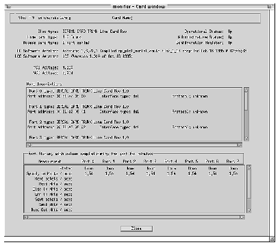 The Card window displays card and port status information and per-port statistics. You can use the vertical scroll bar to view all the relevant port information for the selected card. This window is capable of being displayed, but not edited or modified. However, the monitor application polls the target node for a fixed set of MIB objects and updates the dialog box approximately every 2 minutes.