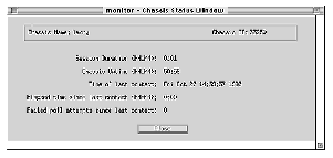 The Chassis Status window displays chassis-level information, such as the chassis name and chassis identification number. It also contains the duration of the monitor session, the time of the last contact with the node, and the time that has elapsed since the last contact.