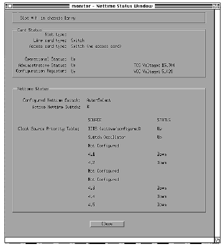 To open a new window for Nettime clock status information, double-click on an Release 2 SWC bulkhead (a bulkhead with a BITS OK LED). A Nettime Status window is displayed (see Figure 4-7).